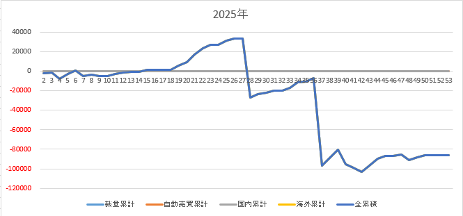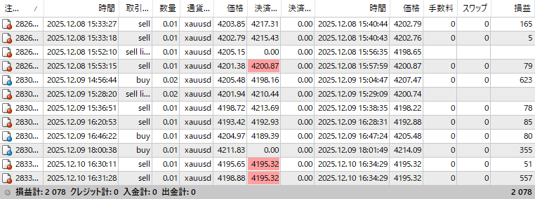 FX裁量 2025年12月2週目の結果 Week50 FX裁量トレード X Facebook はてブ Pocket LINE コピー 2025.12.14 2025年12月2週目(Week50)のFX裁量の結果です。 目次 サマリ業者ごとTitanFXトレード履歴ポジションまとめFXトレード累積グラフ今年の累積 サマリ 今週も勝てましたが、ポジションあたりの獲得pipsが伸ばせませんね 業者ごと TitanFX トレード履歴 ポジション なし まとめ 裁量トレードの合計は2,078円でした。 FXトレード累積 グラフ 毎週エクセルでまとめているグラフを載せておきます。 今年の累積